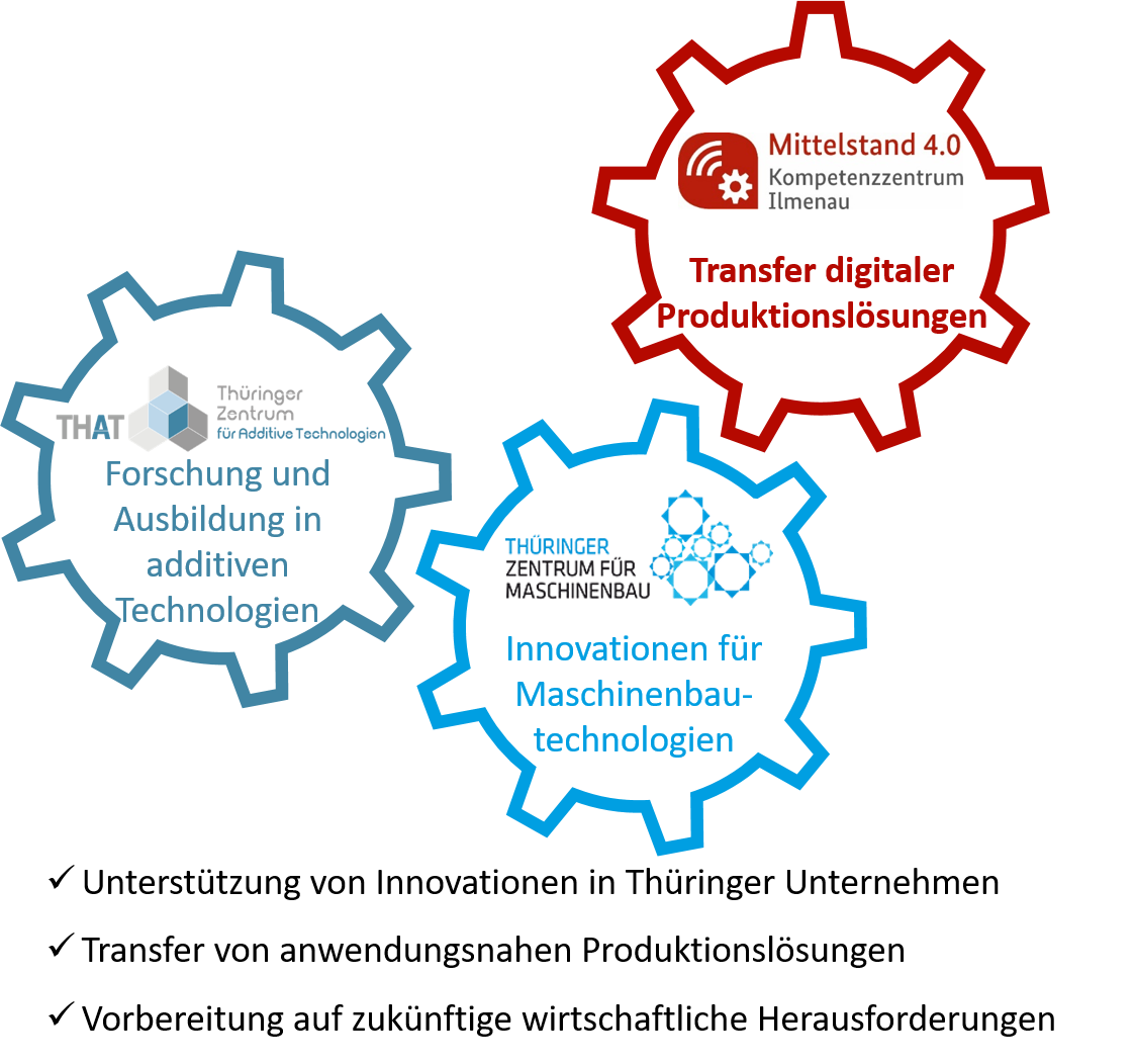Mit den Thüringer Zentren für Maschinenbau, additive Technologien und dem Bundeszentrum Mittelstand 4.0-Kompetenzzentrum Ilmenau sind kompetente Ansprechpartner für genau diese Aufgaben gezielt gegründet und etabliert worden. Das Thüringer Zentrum für Maschinenbau (ThZM) ist eine Plattform für Innovationskooperationen im industriellen Maschinenbausektor und vermittelt Forschungspartner an Hochschulen und Instituten für die Entwicklung von anwendungsreifen Technologien in der Produktion.