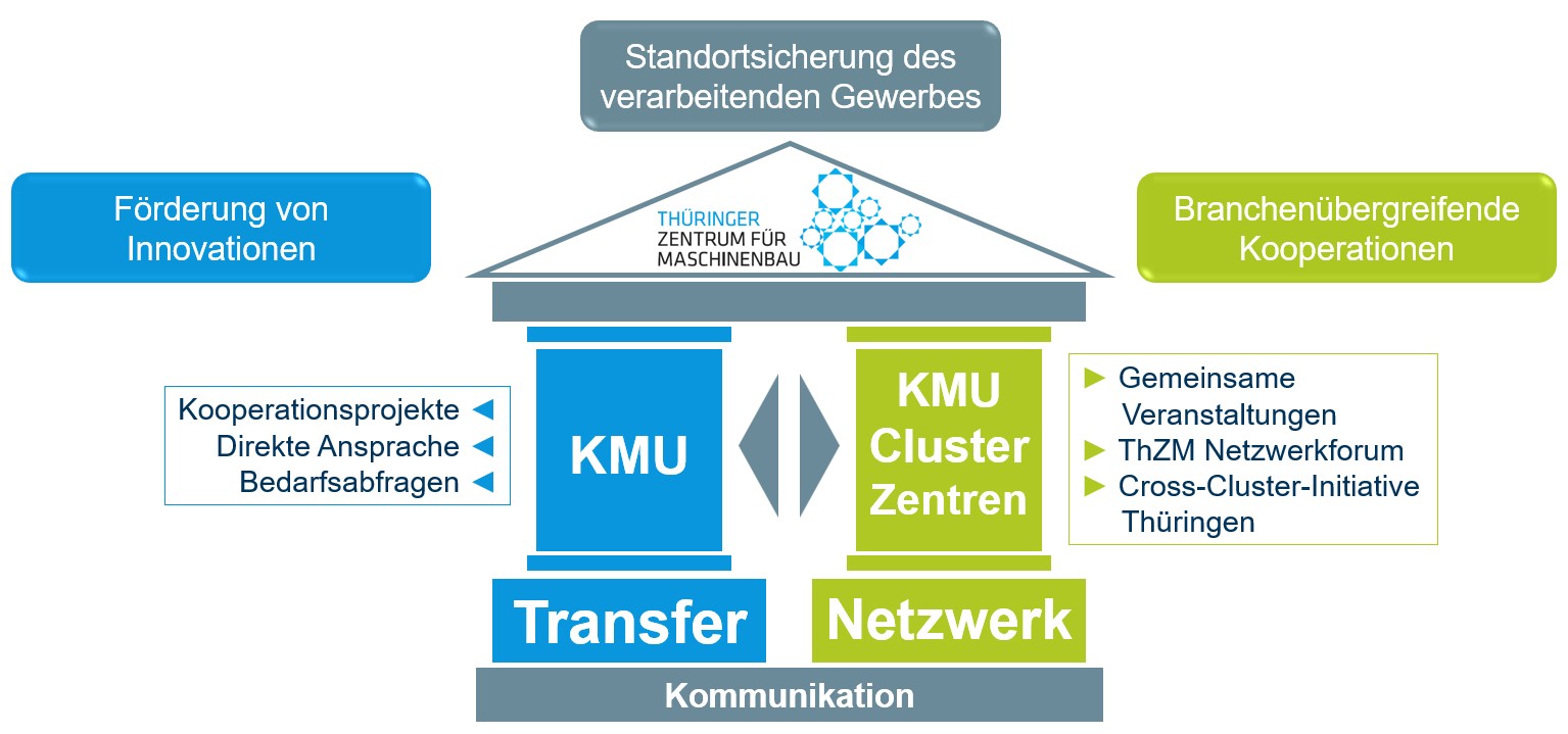 Das ThZM ist die Innovations- und Kommunikationsplattform für das produzierende Gewerbe in der Anwendung von modernen Produktions- und Maschinenbautechnologien in Thüringen. Zur Standortsicherung des verarbeitenden Gewerbes identifizieren wir gemeinsam mit Unternehmen Innovationsbedarfe, vermitteln passende Forschungspartner und entwickeln Lösungen für aktuelle Herausforderungen wie Digitalisierung, Fachkräftesicherung und nachhaltige Produktion. Dabei setzen wir auf Transfer und Netzwerk: Wir fördern den Austausch von Wissen und Technologien zwischen Forschung und Praxis und schaffen starke, branchenübergreifende Kooperationen.